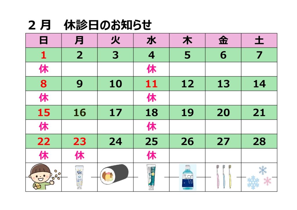 2026年2月3日 / 最終更新日時 : 2026年2月3日 shimada NEWS 【2月の休診日のお知らせ】 2月は通常通り診療いたします。休診日は、水曜日・日曜日・祝日(23日 )となっております。ご予約はお電話、もしくはご来院にて承ります。 初診の方はホームページからのネット予約も受け付けております。 ぜひご利用ください。